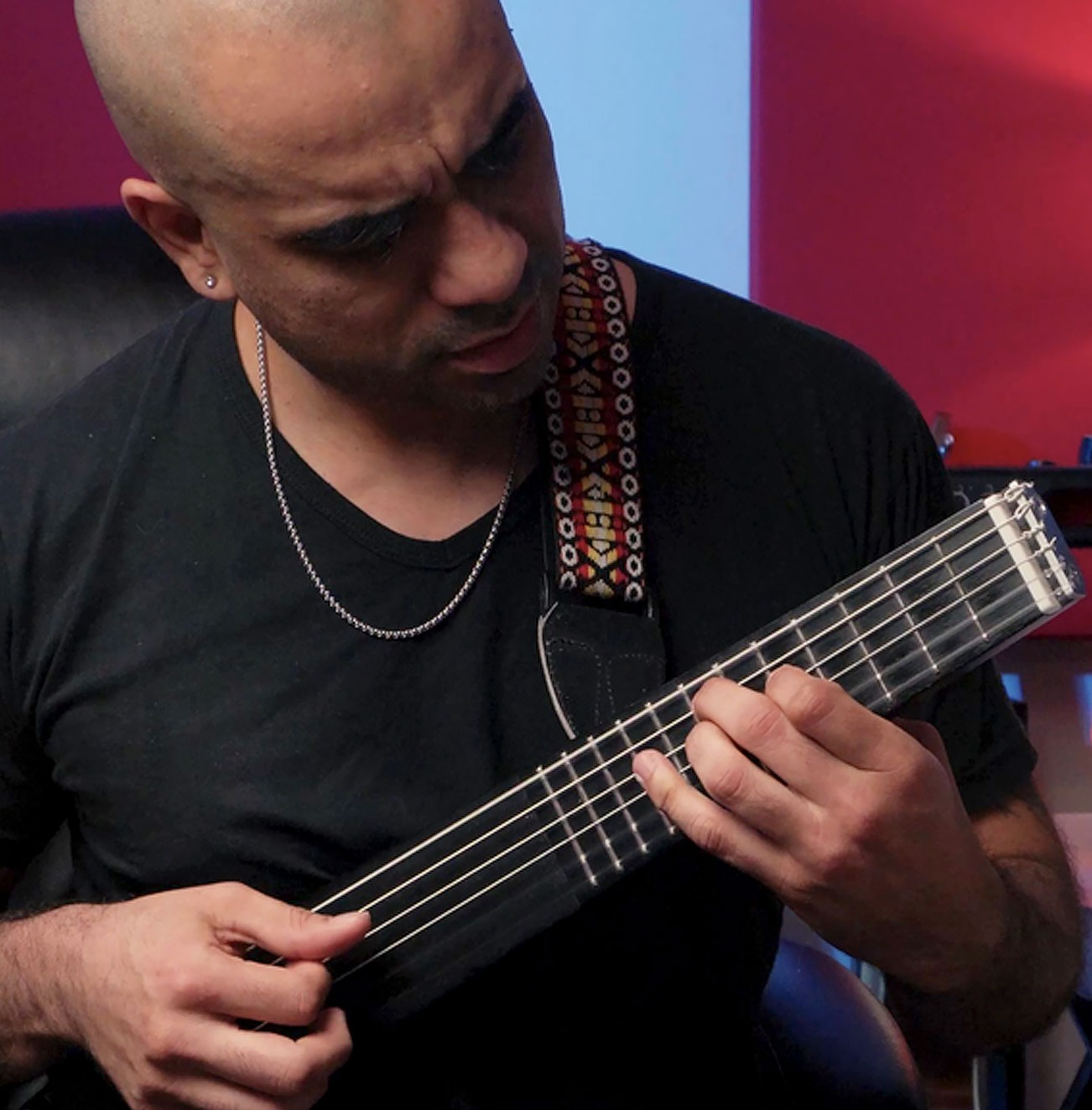 Recomendamos usar tu Minicorda® con una correa de guitarra común pero también podés sostenerla o apoyarla sobre tu pierna.
